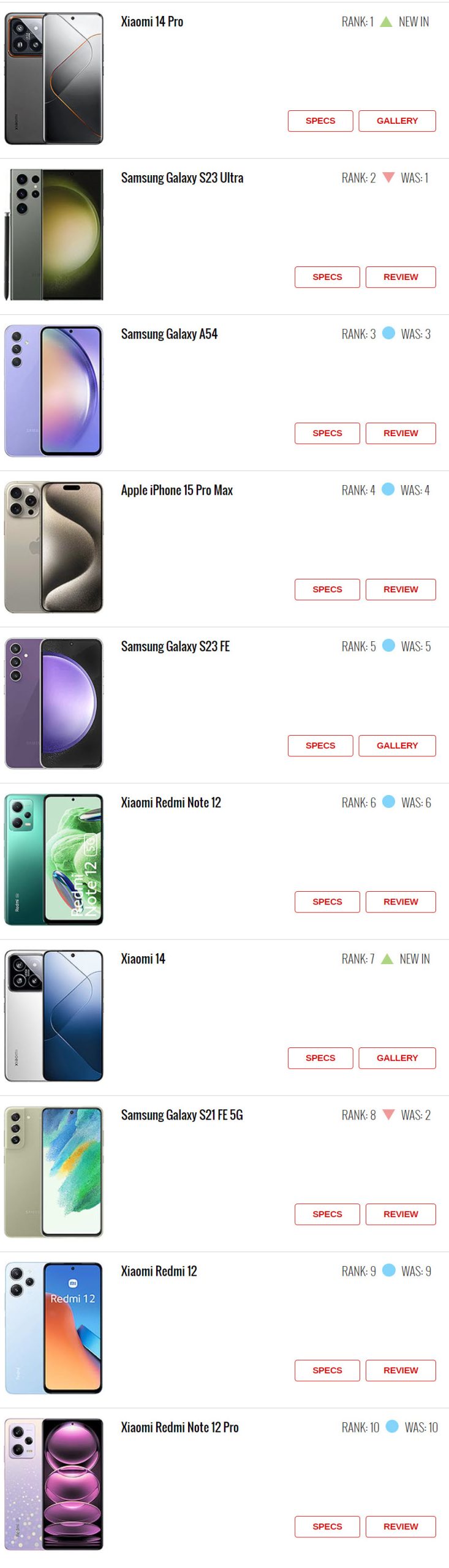 آیفون 15 پرومکس، در رتبه چهارم باقی ماند، در حالی که پشت آن گلکسی اس 23 FE و موبایل ردمی نت 12 نیز حالت قبلی خود را حفظ نمودند. یکی دیگر از اعضای جدید گروه “شیائومی” با نام “وانیل 14” (vanilla 14)در جایگاه هفتم قرار گرفت و گلکسی S21 FE را با اختلاف کمی پشت سر برداشت.