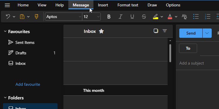 برای شروع کار با Dictate، یک پیشنویس جدید باز کنید. روی دکمه پیام در نوار بالایی کلیک کنید.