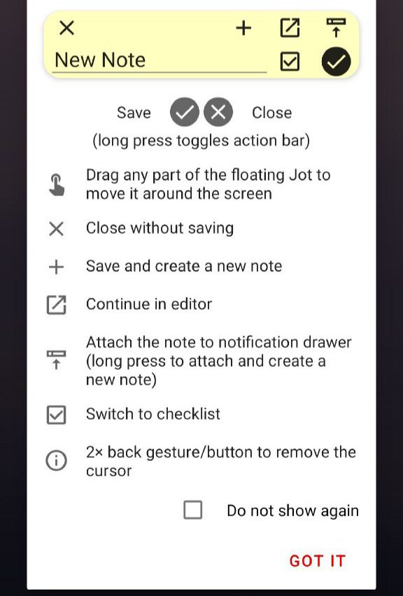 برنامه Jot برنامه‌ای است که به شما امکان می‌دهد در هر جایی یادداشت بنویسید، مهم نیست چه برنامه‌ای در پس‌زمینه در حال اجرا است. می‌توانید دفترچه یادداشت شناور را از پانل تنظیمات سریع (پس از یک فرآیند راه‌اندازی کوتاه) راه‌اندازی کنید یا از ویجت نوار راه‌اندازی استفاده کنید.