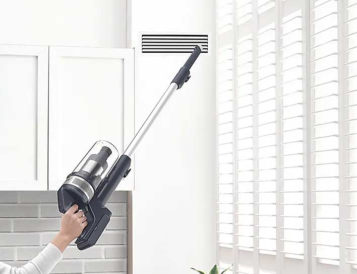 اگر دستان شما موقع استفاده از جاروهای بزرگ دچار مشکل می‌شوند یا سالمندی در خانه دارید که امکان استفاده از وزنه‌های سنگین را ندارد، جارو شارژی جدید سامسونگ همه چیز را آسان می‌کند. وزن 2.7 کیلوگرمی این ابزار کاربردی، به شما کمک می‌کند به‌راحتی آن را جابجا کرده و تمامی بخش‌های خانه با دسترسی دشوار را تمیز کنید. از طرفی، نازل اصلی دارای امکان چرخش 180 درجه است که با تغییر وضعیت مداوم خود با هر فضایی هماهنگ می‌شود تا کاربری آسانی را تجربه کنید.