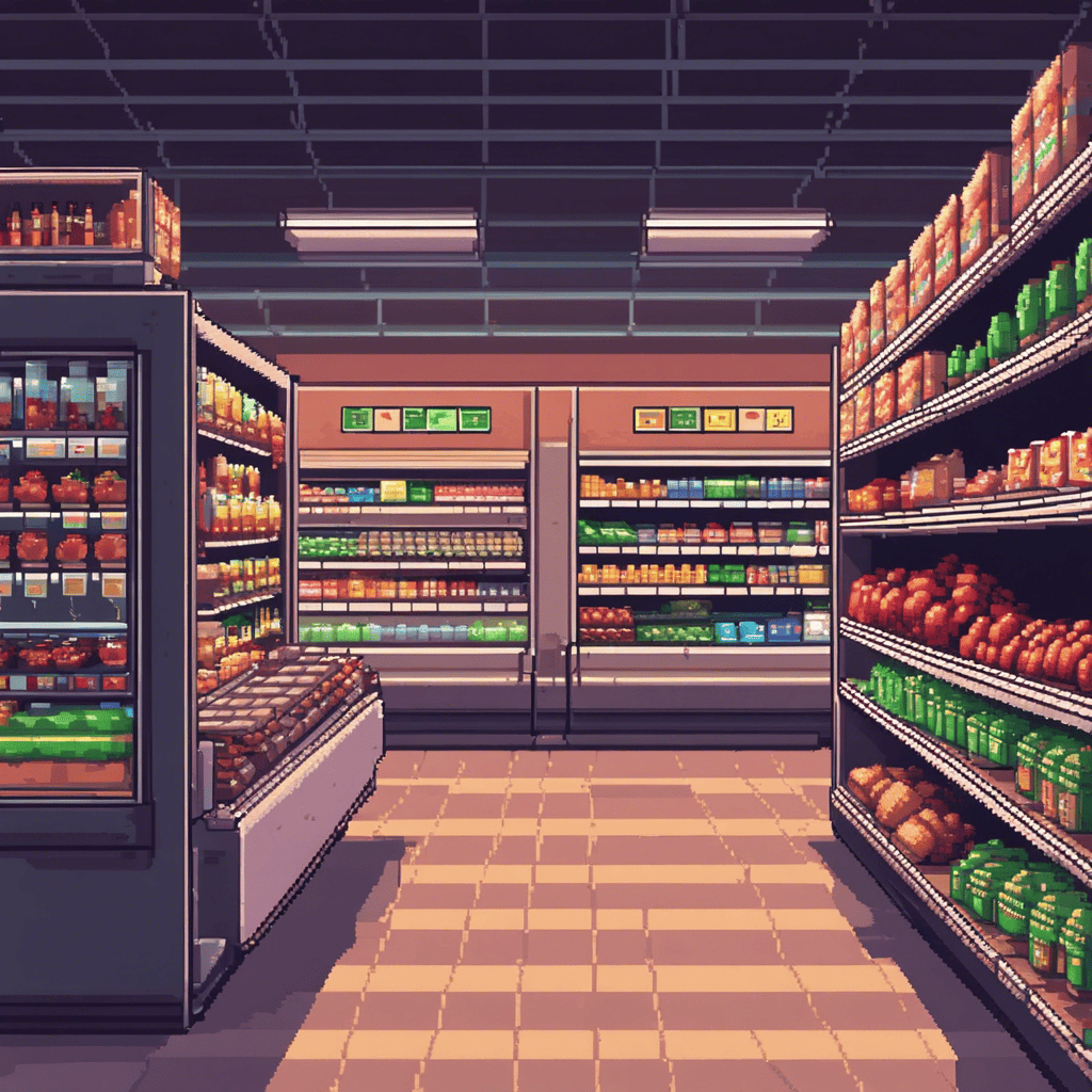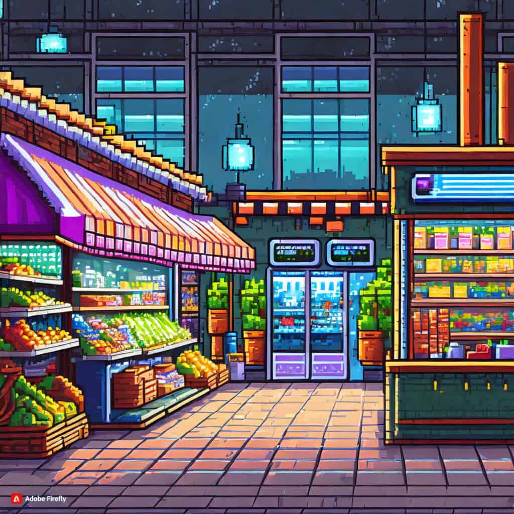 • موضوع: صحنه هنری پیکسل، یک سوپرمارکت ساکت و خالی در شب