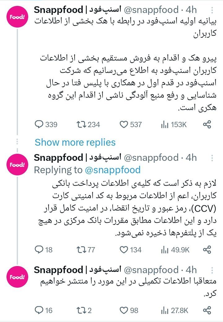 یکی از کاربران شبکه اجتماعی ایکس نیز نوشته است: “ایرنا خبر داده که پلیس فتا هک اطلاعات اسنپ فود رو تأیید کرده، خود اسنپ فود هم بدون کوچکترین عذرخواهی تأیید کرده. حالا کاربران نباید بدونن چه اطلاعاتی و چطور و برای کجا استفاده شده؟ این اطلاعرسانیهای غیرمسئولانه به کدام پرسش کاربران پاسخ میده؟”
