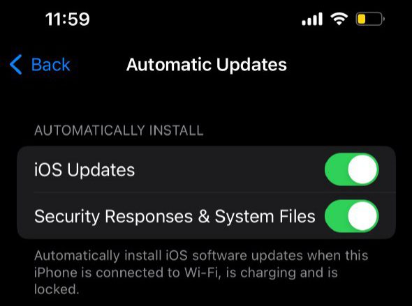در iPhone یا iPad، به Settings > General > Software Update > Automatic Updates بروید. مطمئن شوید که گزینه Security Response & System Files روشن است.