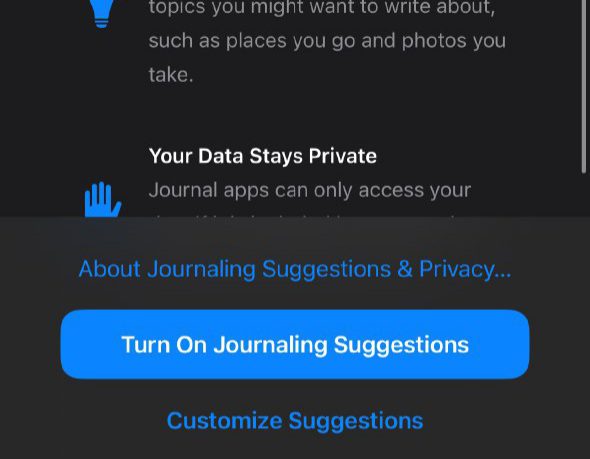 روی Turn On Journaling Suggestions ضربه بزنید و سپس روی Allow (Allow)، اگر می‌خواهید آن را فعال کنید، در غیر اینصورت روی Not Now ضربه بزنید. همچنین در صورت تمایل می‌توانید آن را بعداً از تنظیمات دستگاه خود فعال یا غیرفعال کنید.