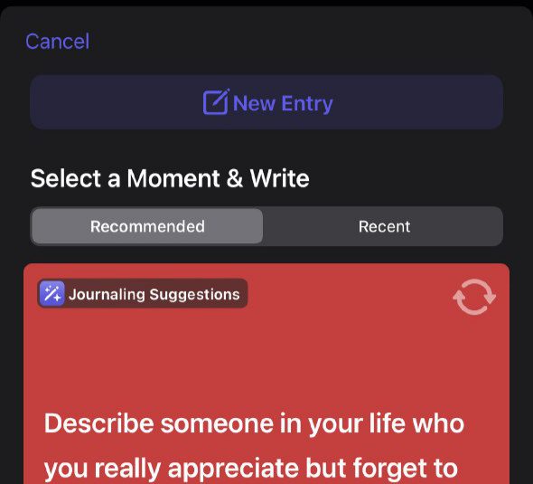 اگر می‌خواهید یک ورودی جدید بر اساس یک پیشنهاد ژورنال‌نویسی ایجاد کنید، برای شروع روی پیشنهادی که دوست دارید ضربه بزنید. اما اگر می‌خواهید بر اساس افکار و سلیقه شخصی خود بنویسید، روی ورودی جدید در بالا ضربه بزنید.