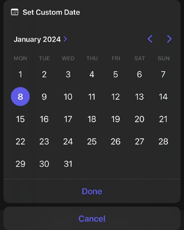 اگر درباره چیزی می‌نویسید که در گذشته اتفاق افتاده یا در حال حاضر اتفاق نمی‌افتد، می‌توانید روی دکمه بیضی (…) در کنار تاریخ فعلی و بعد روی Custom Date ضربه بزنید. پس از تعیین تاریخ برای ورود، روی Done ضربه بزنید.