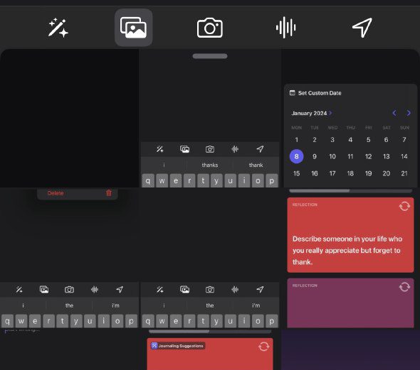 هنگامی که محتوای ورودی خود را نوشتید، می‌توانید روی نماد تصویر ضربه بزنید تا عکس‌ها و ویدیوها را از کتابخانه خود به ورودی مجله خود اضافه کنید. اگر می‌خواهید یک عکس یا ویدیوی جدید بگیرید تا در دفترچه یادداشت خود قرار دهید، به جای آن روی نماد دوربین ضربه بزنید. به همین ترتیب، می‌توانید برای ضبط صدا روی نماد صدا ضربه بزنید و آن را به ورودی خود نیز پیوست کنید.