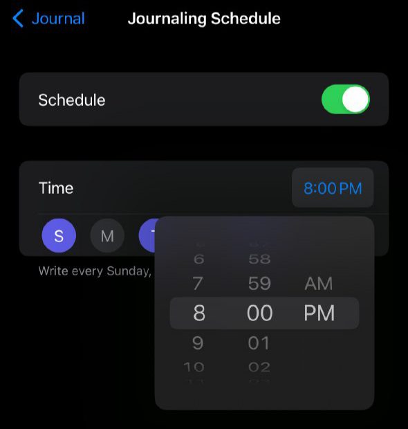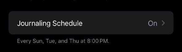 اگر حفظ یک برنامه منظم برای ژورنال‌نویسی برای شما چالش برانگیز است، توصیه می‌کنیم یک برنامه زمانی برای ژورنال‌نویسی تنظیم کنید. این ویژگی هر روز (یا در روزهای خاصی از هفته) یادآورهایی را برای نوشتن یک ورودی مجله جدید، در زمان مشخص ارسال می‌کند. برای تنظیم این مورد، به Settings > Journal بروید، روی Journaling Schedule ضربه بزنید و آن را روشن کنید. زمان اعلان ترجیحی و روزهایی را که می‌خواهید یادآور دریافت کنید، انتخاب کنید.