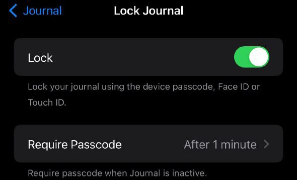 قفل کردن برنامه مجله، حریم خصوصی ورودی‌های شما را با نیاز به رمز عبور آیفون، Face ID یا Touch ID برای دسترسی، افزایش می‌دهد. برای فعال کردن این ویژگی، به برنامه Settings بروید، به گزینه Journal بروید، Lock Journal را انتخاب کنید و رمز عبور آیفون خود را وارد کنید. در نهایت، سوئیچ کنار قفل را روشن کنید.