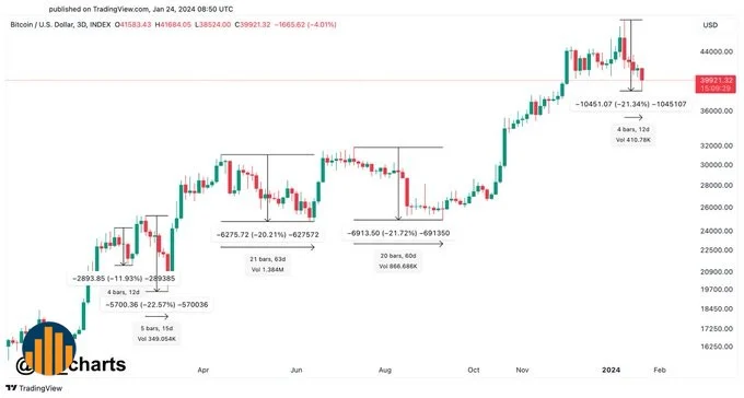 این تحلیلگر در پست خود که در رسانه اجتماعی X منتشر کرده است خاطرنشان کرد که اصلاحات در طول بازار صعودی به طور متوسط 21٪ بوده است. او همچنین اشاره کرد که بیتکوین این بار نیز همین روند را در پیش گرفته است. بنابراین، کاربران بایستی ازین ریزش قیمت برای خرید در سطوح پایینتر استفاده کنند.