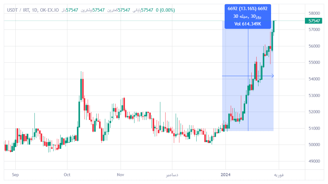 این رشد قابل‌توجه تتر در حالی رخ داده است که از اوایل آبان تا روزهای ابتدایی دی، قیمت در حال تثبیت بین 53000 تا 50000 تومان بود.