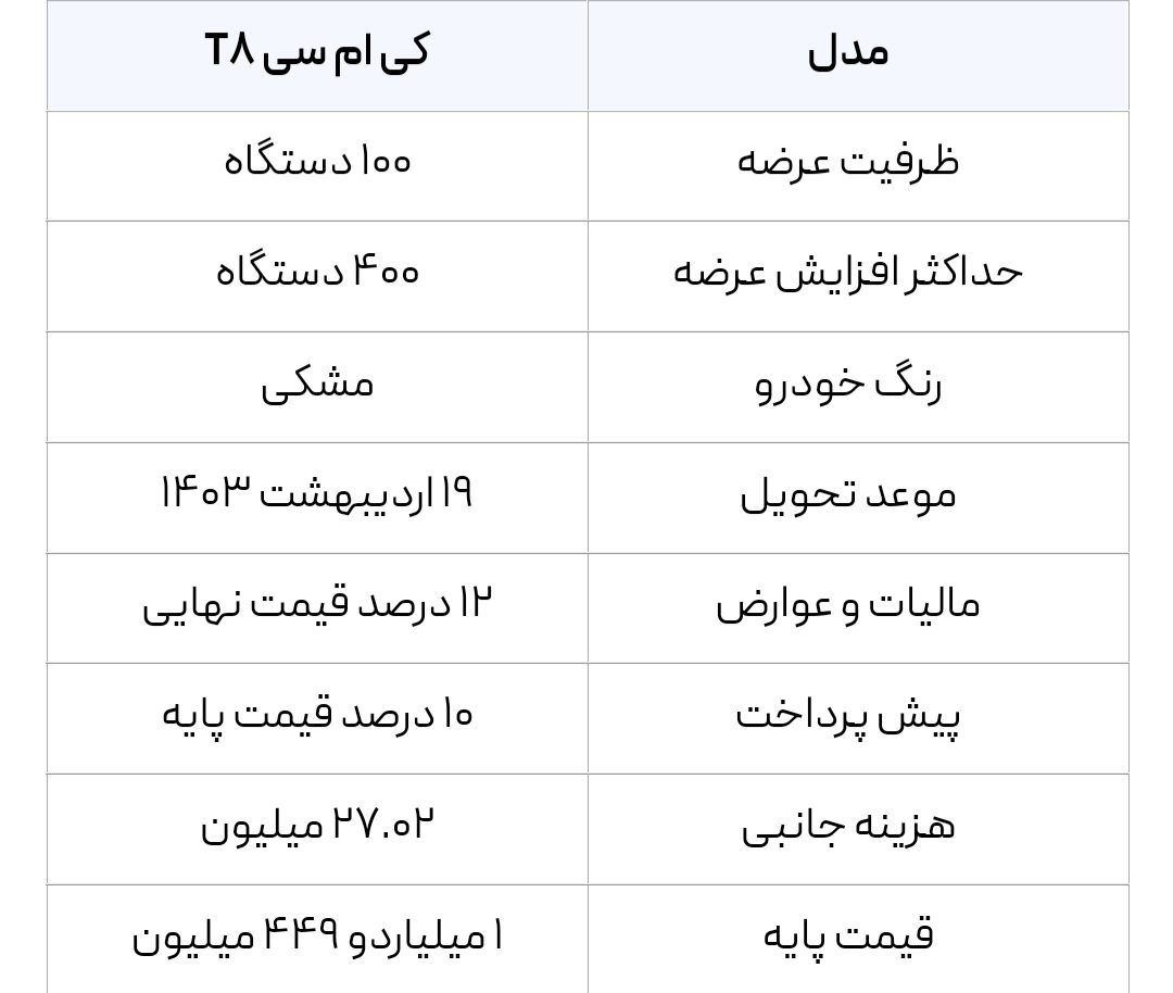 شرکت کرمان موتور برای نخستینبار در سال 1402، به بورس کالا آمد. عرضه کرمان موتور در بورس کالا، روز سهشنبه مورخ 1402/11/24 انجام شده و طی آن قرار است خودروی KMC T8 به تعداد اولیه 100 دستگاه (امکان افزایش تا 500 دستگاه) با شرایط زیر، به فروش گذاشته شود: