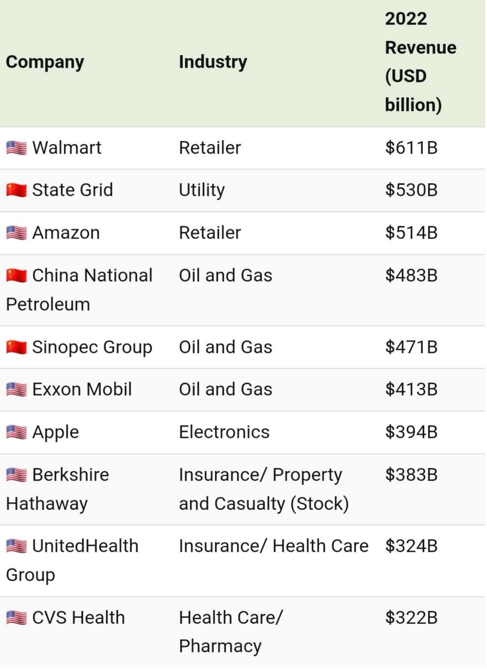 چین در مجموع مدعی سه جایگاه در بین پنج شرکت برتر است و شرکتهای نفت و گاز China National Petroleum و Sinopec Group بالاتر از شرکتهایی مانند ExxonMobil، Apple و Berkshire Hathaway هستند.