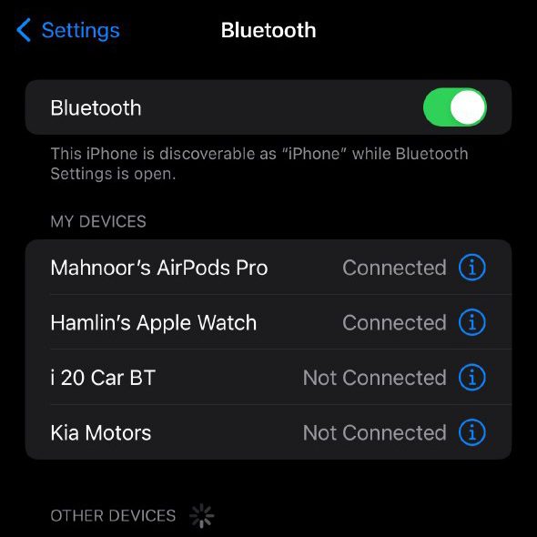 سپس AirPods را از تنظیمات بلوتوث دستگاه خود حذف کنید. در آیفون‌ها، می‌توانید به settings > bluetooth بروید و روی دکمه info (i) در کنار نام AirPods خود ضربه بزنید تا گزینه Forget This Device را پیدا کنید.