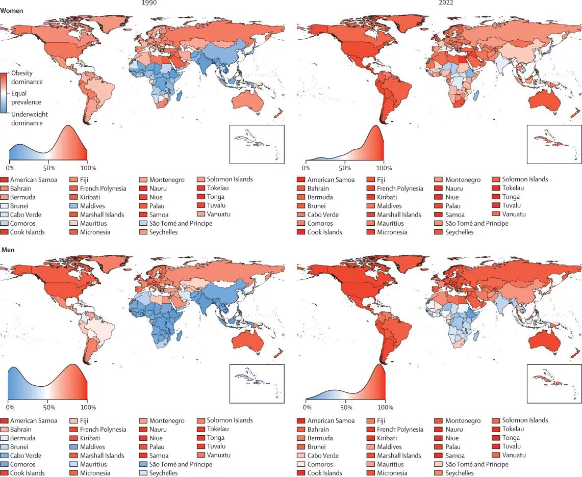 طبق تخمینها، 504 میلیون زن بزرگسال و 374 میلیون مرد بزرگسال در سال 2022 چاق بودند. این یعنی تعداد زنان مبتلا به چاقی دو برابر، و تعداد زنان مبتلا به چاقی از سال 1990 سه برابر شده است. تعداد کودکان و نوجوانان مبتلا به چاقی از 31 میلیون در سال 1990 به 159 میلیون نفر در سال 2022 رسیده است.