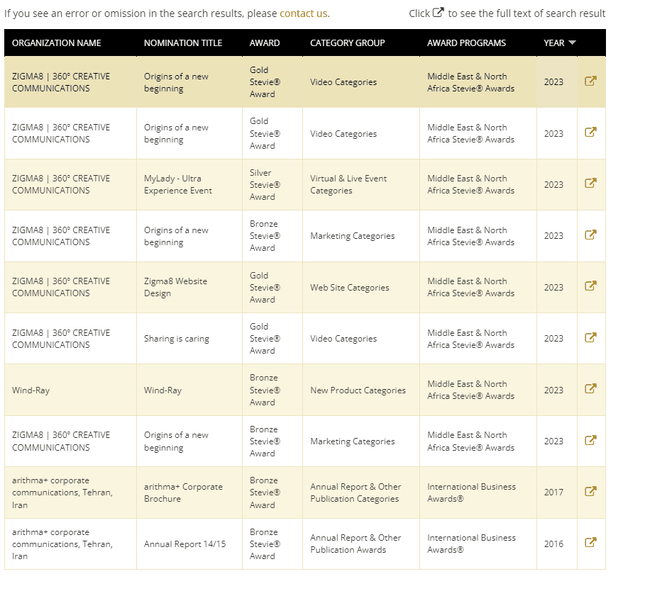 1. Stevie Awards: مراسم اعطای این جایزه هرساله در 8 دسته‌بندی مختلف در رقابتی با شرکت بیش از 12 هزار سازمان و شرکت از بیش از 70 کشور برگزار می‌شود.