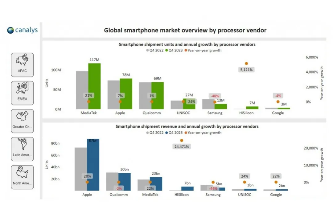 گزارش کانالیس مدیاتک و کوالکام و اپل را به‌عنوان سه ارائه‌دهنده‌ی برتر پردازنده در بازار جهانی در سه‌ماهه‌ی چهارم سال 2023 معرفی کرده است. نام شرکت های‌سیلیکون نیز به‌عنوان یکی از تولیدکنندگان چینی پردازنده‌های موبایلی و زیرمجموعه‌ی هواوی با 7 میلیون دستگاه و 7 میلیارد دلار درآمد در این گزارش آمده است.