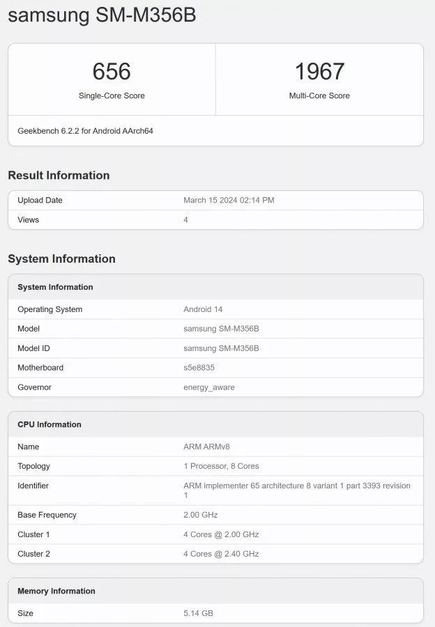 در نتایج بنچمارک، این گوشی در تست تکهستهای امتیاز 656 و در تست چندهستهای امتیاز 1967 را کسب کرده است. گوشی مورد آزمایش که بهاحتمالفراوان گلکسی M35 باشد، به 6 گیگابایت رم مجهز است و سامسونگ احتمالاً پیکربندیهای حافظه داخلی متفاوتی را در زمان عرضه ارائه خواهد کرد. علاوهبراین، سیستمعامل این گوشی اندروید 14 خواهد بود.