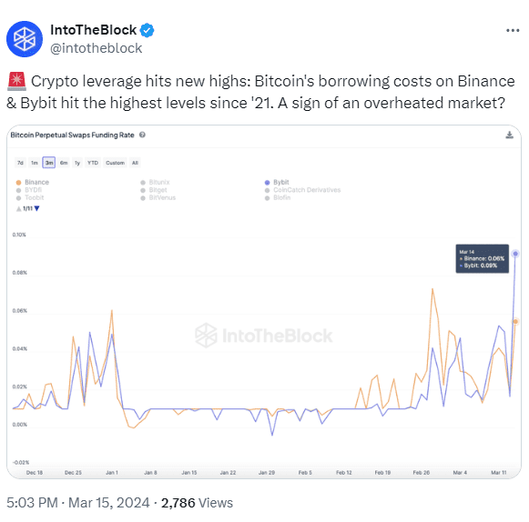 با این حال، پلتفرم تحلیلی IntoTheBlock افزایش استفاده از اهرم (قرض گرفتن پول از صرافی) در معاملات ارزهای دیجیتال را گزارش کرده است. این پلتفرم میگوید که هزینههای استقراض بیت کوین در صرافیهایی مانند بایبیت (ByBit) و بایننس (Binance) به بالاترین حد خود از سال 2021 رسیده است.