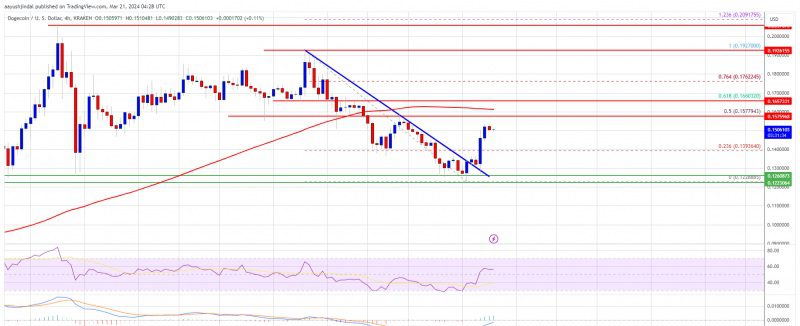 همچنین، در نمودار 4 ساعته جفت ارز دوجکوین/دلار آمریکا، یک بریکآوت در بالای خط روند نزولی کلیدی با مقاومت 0.1310 دلار وجود داشت. دوجکوین همچنان زیر سطح 0.160 دلار و میانگین متحرک ساده 100 در تایم فریم 4 ساعته معامله میشود.