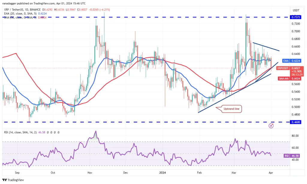 شیب میانگین متحرک نمایی 20 روزه مسطح بوده و شاخص قدرت نسبی در محدوده اندکی پایینتر از نقطه میانی قرار دارد که برتری خاصی را به هیچ یک از گروههای خریداران یا فروشندگان اعطا نمیکند. خریداران باید قیمت ریپل را به سمت بالای مثلث هُل دهند تا بتوان گفت روند صعودی به سمت سطح مقاومتی سرسخت 0.74 دلاری آغاز شده است.