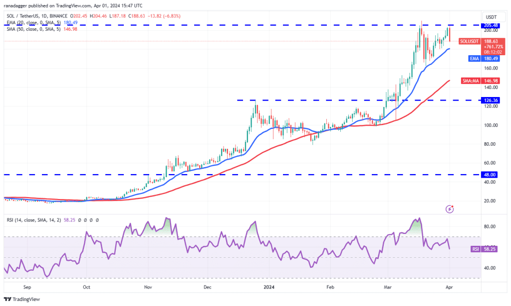 بهای سولانا میتواند تا میانگین متحرک نمایی 20 روزه در سطح 180 دلاری پایین بیاید که سطح حمایت کلیدی و مورد توجهی محسوب میشود. چنانچه قیمت از میانگین متحرک نمایی 20 روزه بازگردد، نشاندهنده ادامه خرید بیشتر خریداران در ریزش بازار خواهد بود. این موضوع احتمال شکستن سطح مقاومت 205 دلاری را افزایش میدهد. در صورت تحقق این امر، قیمت سولانا میتواند روند صعودی خود را از سر گرفته و تا سطح 267 دلار پیشروی کند.