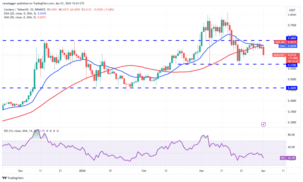 فروشندگان موفق شدهاند که قیمت کاردانو را به زیر سطح حمایت فوری 0.63 دلاری بکشانند و تلاش خواهند کرد تا روند نزولی را به سمت حمایت بحرانی 0.57 دلاری ادامه دهند. چنانچه قیمت از سطح حمایت 0.57 دلاری مجدداً جهش کند، بهای ADA ممکن است برای مدتی در محدوده نوسانی 0.57 دلار تا 0.68 دلار باقی بماند.