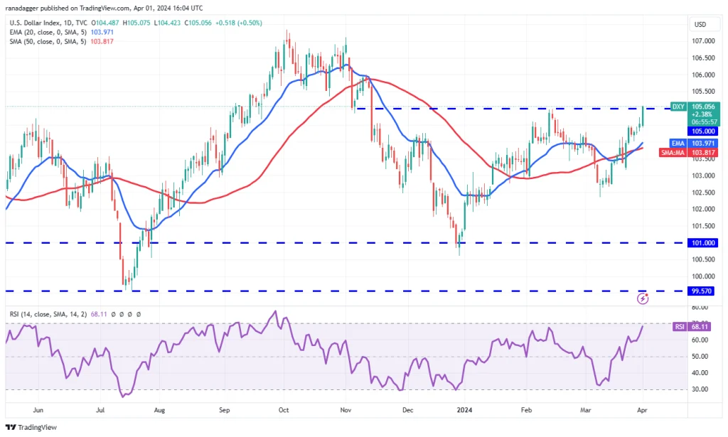 شاخص دلار آمریکا (DXY) روندی صعودی را در پیش گرفته و به محدوده مقاومت کلیدی بالای 105 واحد رسیده است.