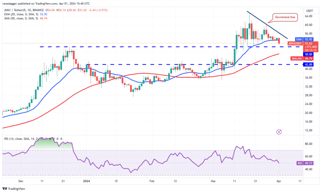 روند فروش در تاریخ یکم آوریل (13 فروردین) شدت گرفت و فروشندگان توانستند قیمت آوالانچ را تا سطح حمایتی 50 دلار پایین بکشانند. این سطح حمایتی یکی از مهمترین سطوحی است که باید مورد توجه قرار گیرد، زیرا شکست روبهپایین آن میتواند شتاب فروش را افزایش داده و بهای آوالانچ تا 42 دلار سقوط کند.