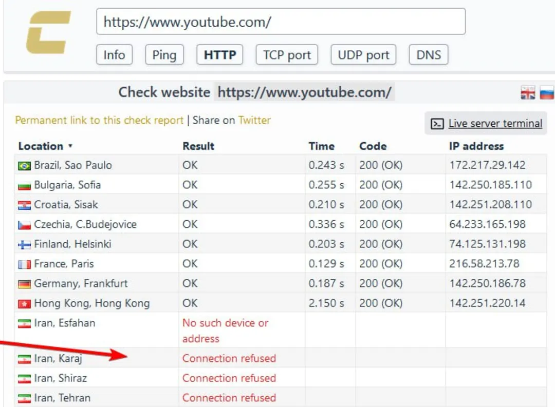 بررسیها نشان میدهد که وبسایت مذکور با اینترنت اپراتورهایی ازجمله مخابرات و همراه اول دردسترس نیست؛ اما ازطریق اپراتورهایی مانند ایرانسل و رسپینا بدون نیاز به VPN دردسترس قرار دارد.