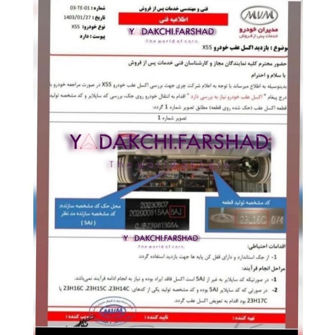 همانطور که در تصویر بالا مشاهده میکنید، در این اطلاعیه درخواست چک اکسل عقب خودرو به نمایندگیها داده شده است. در صورتیکه ساپلایر اکسل، 5AJ باشد اکسل باید تعویض گردد.